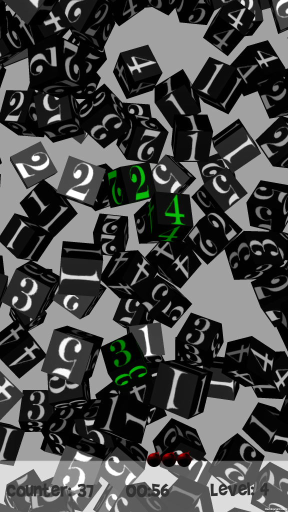 Player must be able to use some of active skills. The first skill which has been implemented was making the reset of the current sum up values. It is helpful when Player has made the mistake and over count, or don’t remember all values from touched cubes and he would like to avoid resetting the game into the first level. For such situations there is an active skill, which was illustrated as a small bomb icon. There were 3 attempts to use this skill, and the only situation where the skill was refiled was the game reset i.e. after lose the current game level. This skill could be triggered by swiping down on the phone.
